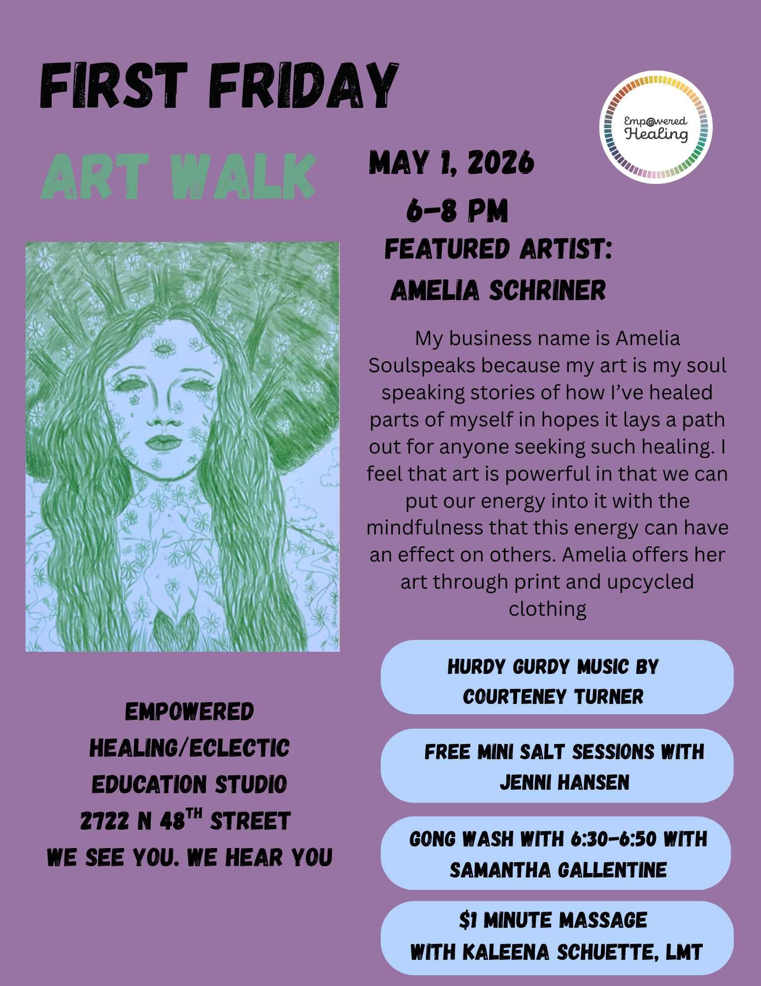 Please join us for our First Friday art walk and open house! Both floors of our studio will be open and activities include: Featured artist, Allie West, Tarot card readings by Courteney Turner, FREE 10 minute mini salt room sessions, $1 minute (cash only) massage by Kaleena Schuette (through the clothes), & a gong wash by Samantha Gallentine from 6:30-6:50 pm. Come and see our artistic space and enjoy some complimentary tea.